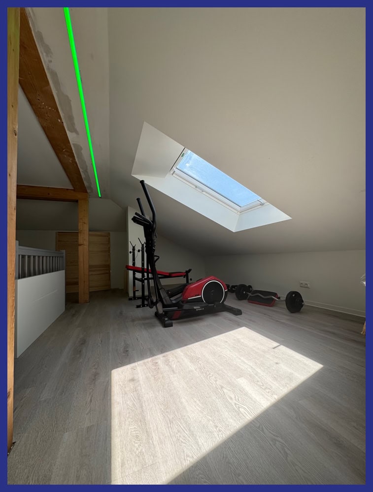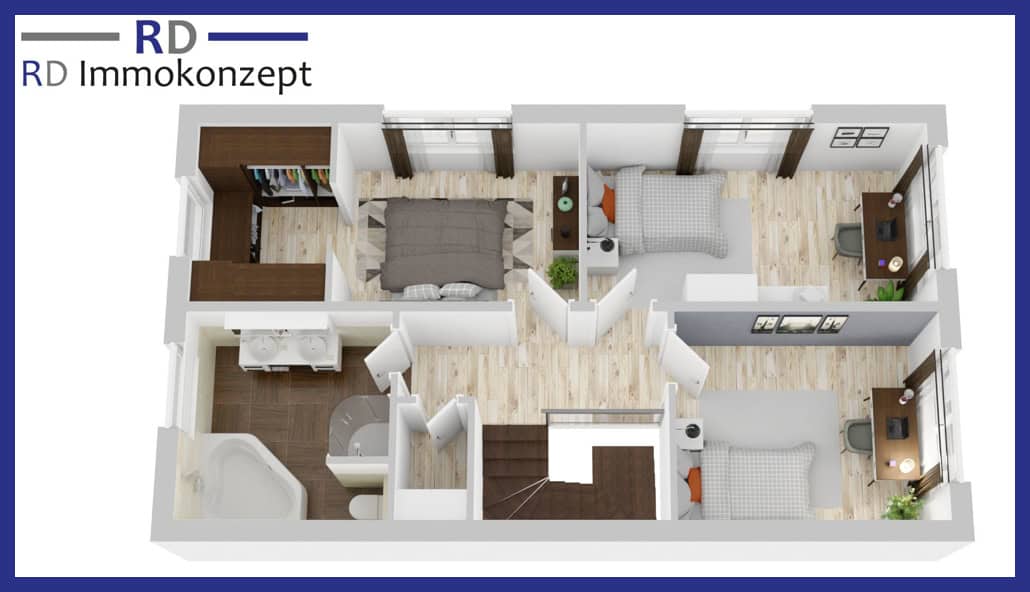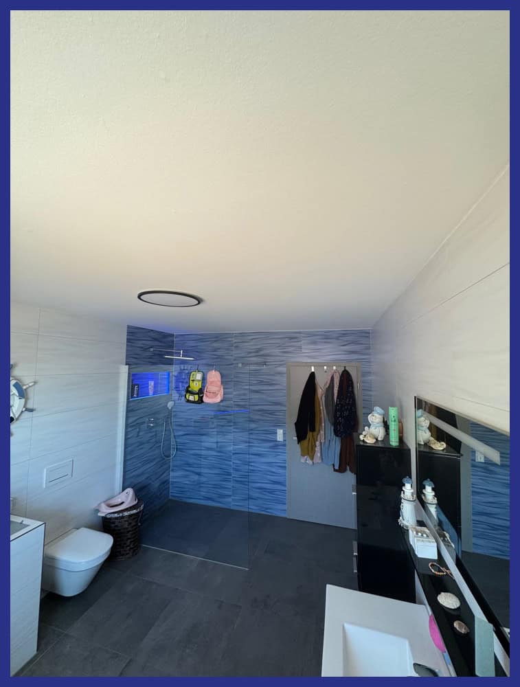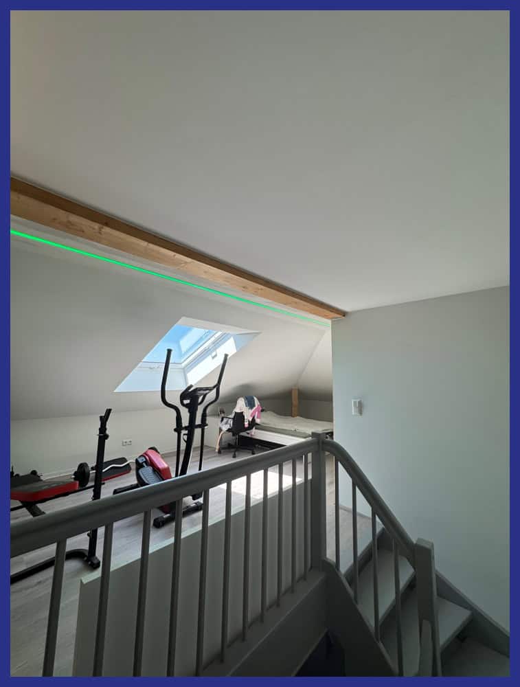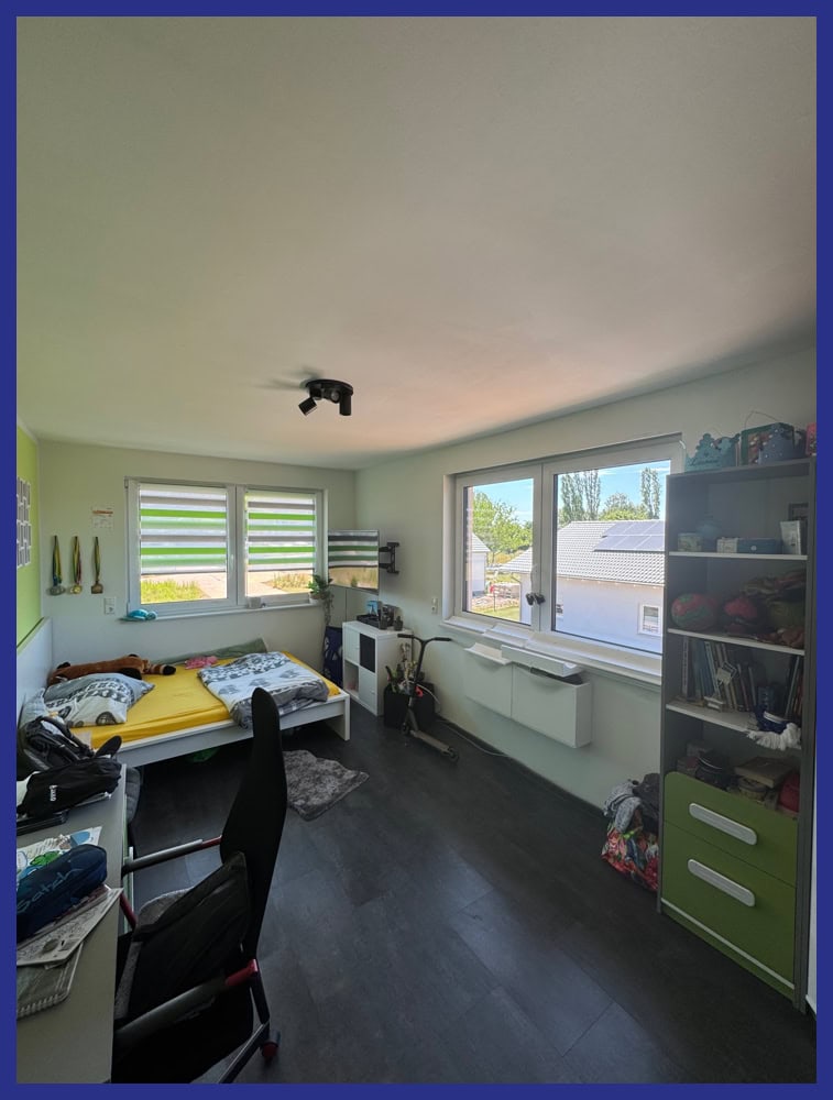 Die zwei Kinderzimmer mit reichlich 14m² bieten viel Platz zum Lernen oder Spielen. Das Elternschlafzimmer ist nördlich ausgerichtet und damit optimal für die Erholung. Das angrenzende Zimmer ist als begehbarer Kleiderschrank genutzt. Großzügig, aber praktisch, wurde das Bad konzipiert. WC, Eckbadewanne, ein doppeltes Waschbecken, Handtuchheizkörper und Dusche sind selbstverständlich. Ein Wäscheschacht direkt in den Hauswirtschaftsraum ist einfach praktisch. Indirekte LED Beleuchtungen werten die Badausstattungen auf. Das DG wurde als Dachstudio ausgebaut und kann wunderbar als Arbeits/Freizeitbereich dienen. Selbst eine Abtrennung als separates Zimmer ist mit wenig Aufwand möglich.
