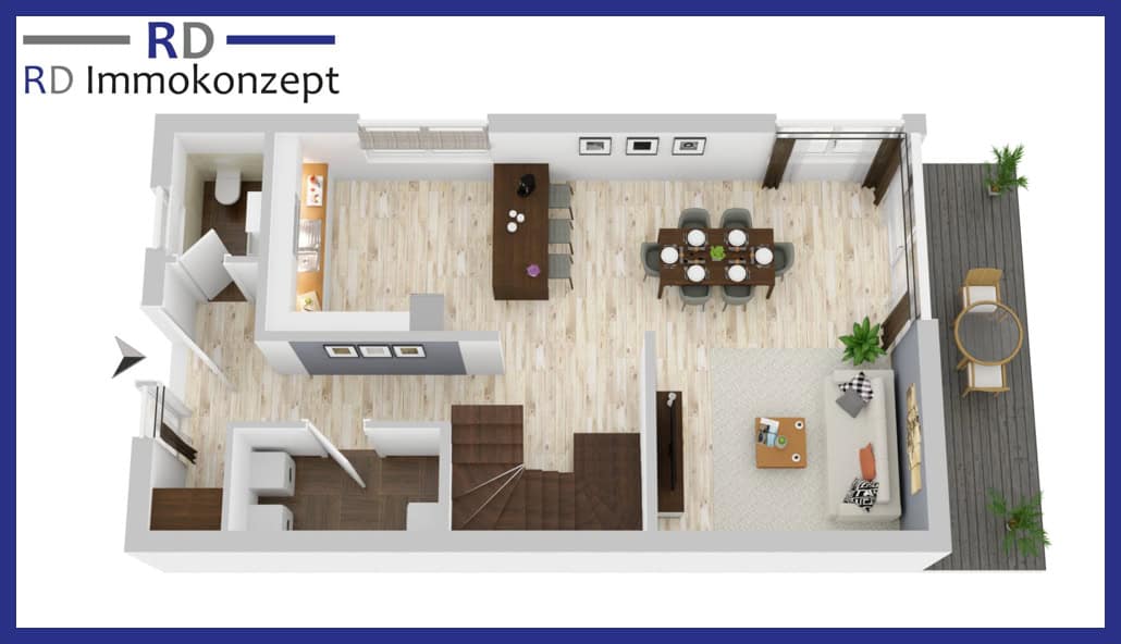Die Doppelhaushälfte ist hell und praktisch geschnitten. Durch den Eingangsbereich betreten sie den Flur. Das Haus empfängt Sie mit einem kleinen Garderobenbereich und Gäste-WC für das EG. Hier grenzt dann der Hauswirtschaftsraum an den Flur an. Das weitere Erdgeschoss ist als offener, großzügiger Wohn/Koch und Essbereich geschnitten. Von hier aus geht es raus ins Freie auf die Terrasse und den Garten. Die großzügige Wohnebene öffnet sich mit großen Fensterflächen Richtung Garten und Terrasse. Die bodentiefen Fenster sorgen für lichtdurchflutetes Wohnen. Die großformatigen Bodenbeläge sind robust und zeitlos.