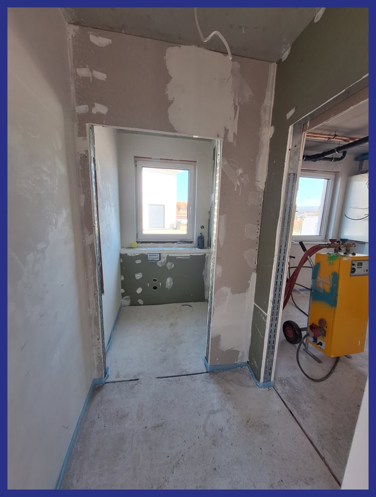 Vinylbodenbelag in den Wohnräumen, großformatige Fliesen in den Bädern.