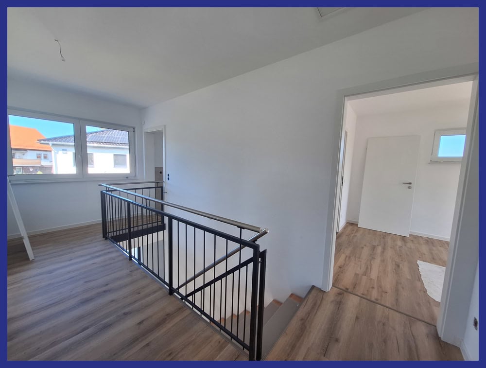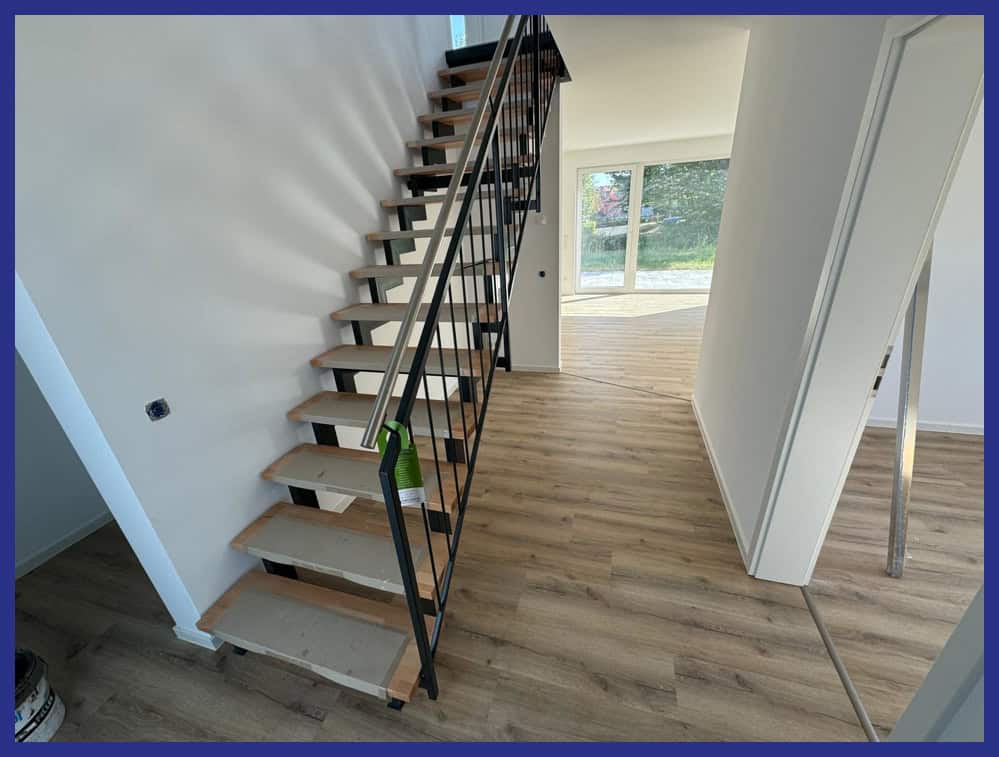 Durch den Eingangsbereich betreten sie den Flur mit offener Treppe ins Obergeschoss. Von hier erreichen sie das Gäste-WC und den Hauswirtschaftsraum.