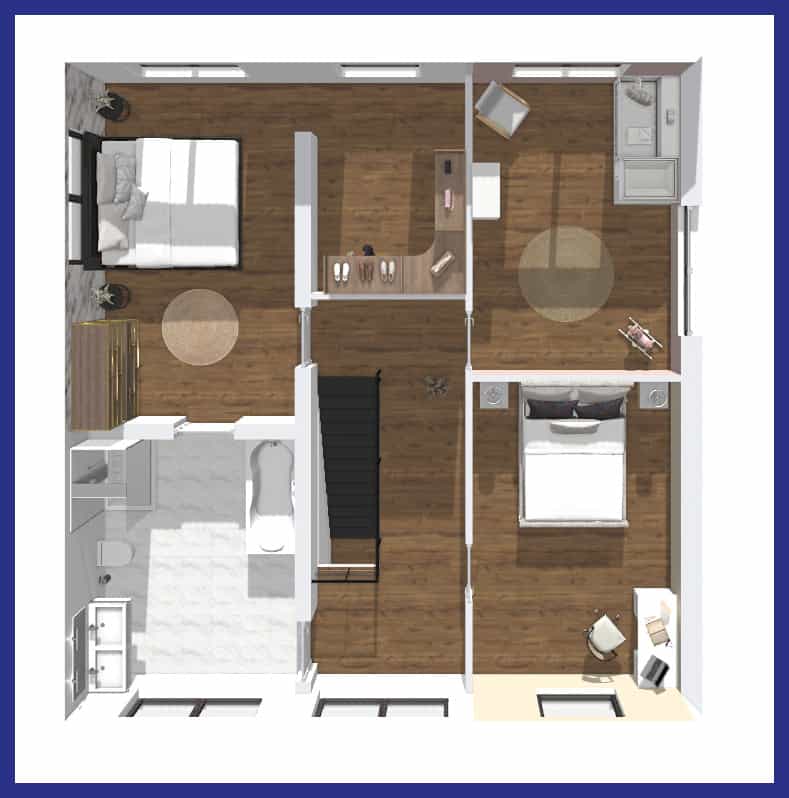 Das Bad wurde großzügig, aber praktisch konzipiert. Dusche, Badewanne, ein doppeltes Waschbecken und Handtuchheizkörper sind selbstverständlich. Der Zugang ist vom Flur oder vom Elternschlafzimmer aus möglich.
