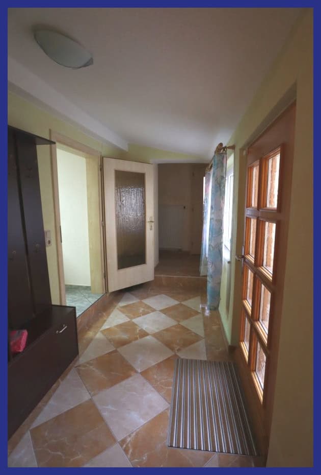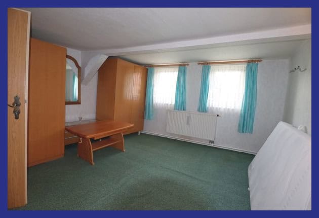 Das Haus selbst betreten Sie durch den Eingangsbereich in einen zentralen Flur, von hier gelangen Sie in EG - Küche, Wohnzimmer, Gäste-WC, Bad sowie ein kombiniertes Wohnschlafzimmer. Dieses befindet sich schon wieder im zweiten Gebäudeteil und grenzt dort an das zweite vorhandene kleine Treppenhaus an. Im Obergeschoss befinden sich Flure, zwei Schlafzimmer sowie im anderen Gebäudeteil nochmals drei Zimmer in unterschiedlichen Renovierungs- bzw. Modernisierungsständen. Der Spitzboden selbst ist nicht ausgebaut und ein reiner Kaltbereich. Das Haus selbst ist teilsaniert, so wurde in den 90er Jahren eine Öl-Zentralheizung eingebaut, Kunststofffenster mit Isolierglas verbaut. Bäder, Küche erneuert und die genutzten Räume durchmodernisiert. Die Elektroinstallation ist größtenteils erneuert und müsste in den Bereichen der unrenovierten Zimmer noch ertüchtigt werden.