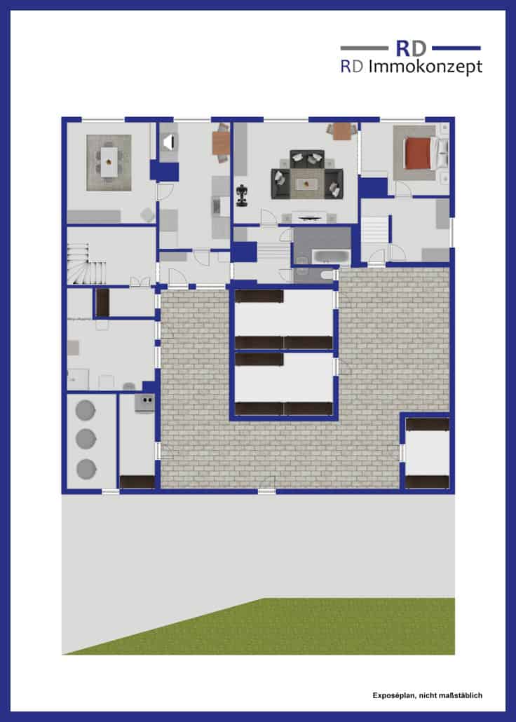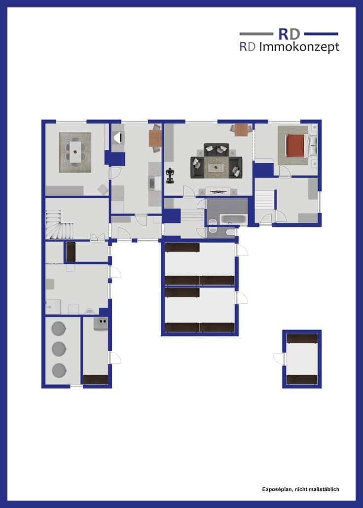 Das Grundstück verfügt im Hofbereich über eine ehemalige Scheune, welche zurückgebaut werden könnte. Damit würde sich ein geschlossener, nach Süden geöffneter Hofbereich ergeben. Zurzeit befinden sich im Erdgeschoss ehemalige Stallungen und im Obergeschoss Lagerboden.