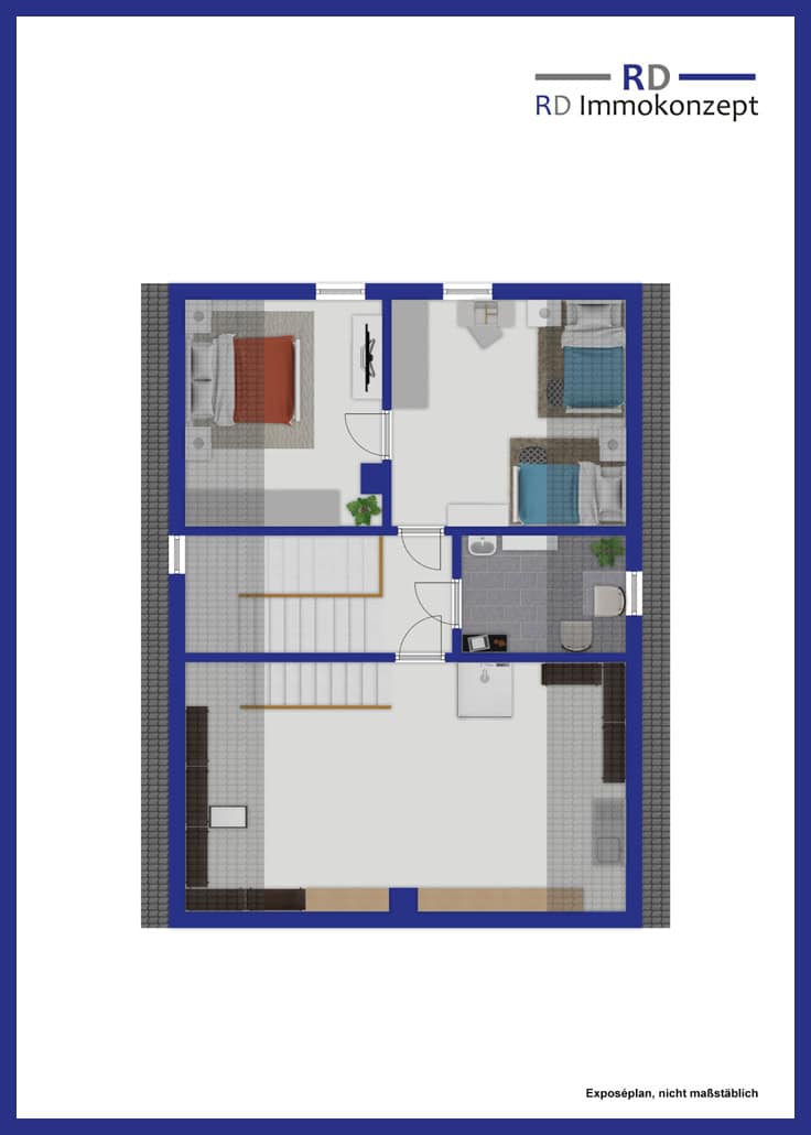 Noch weitere drei Wohnräume befinden sich im Dachgeschoss und zusätzlich ein noch nicht ausgebauter Bodenbereich, welcher als Lager- und Wäscheboden dient. Der Spitzboden selbst ist reiner Kaltbereich und ebenfalls nicht ausgebaut.