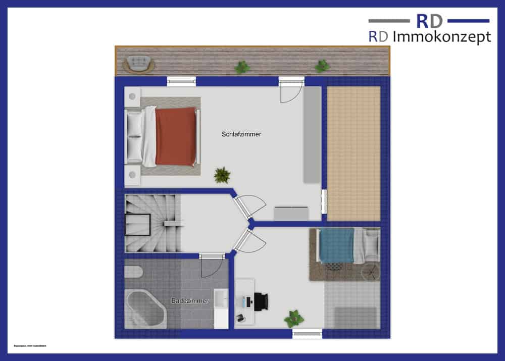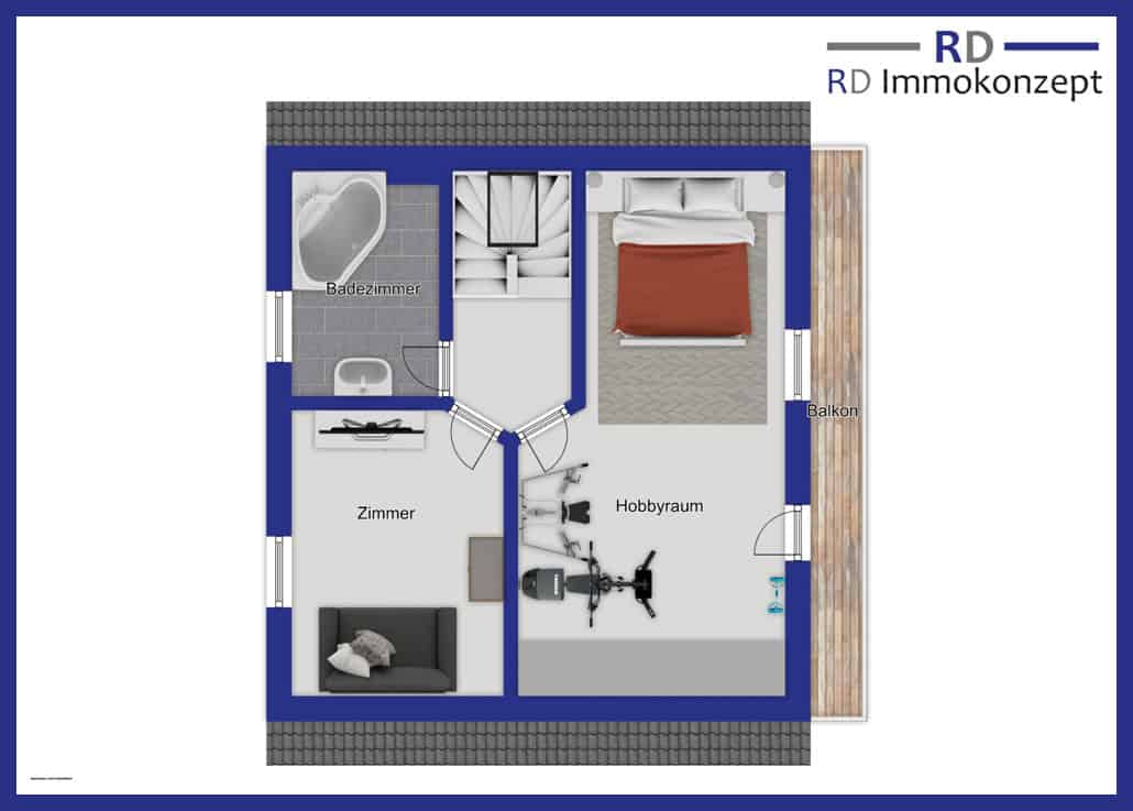 Das OG gliedert sich in Bad, Kinder oder Arbeitszimmer plus Eltern Schlafzimmer mit Zugang zum Balkon. Ein weiteres Kinderzimmer lässt sich durch Teilung des Schlafzimmers mit überschaubarem Aufwand realisieren. Die entstehenden Zimme haben dann ca. 12m²-14m², jeweils mit Fenster oder Fenstertür zum Balkon.