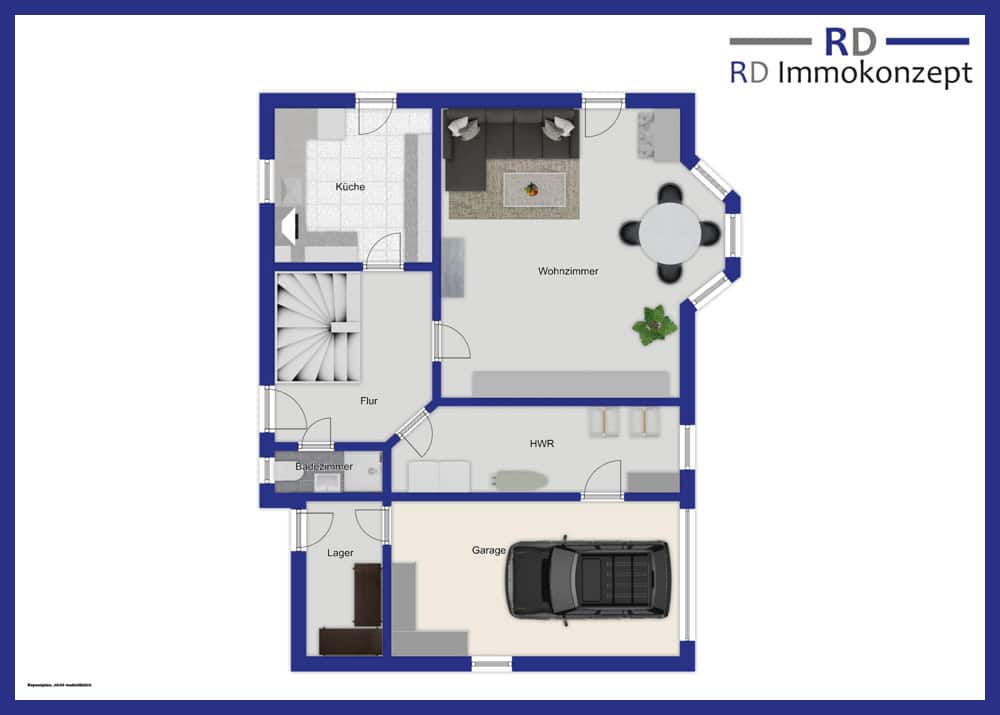 Das Einfamilienhaus selbst, bietet ca. 125 Quadratmeter Wohnfläche und verfügt im Erdgeschoss über Flur, Gästebad, Wirtschaftsraum, Küche und Wohnzimmer mit Ausgang zur Terrasse und Kamin für gemütliche Winterabende. An den Hauswirtschaftsraum schließt sich die Garage an, welche im hinteren Bereich nochmals über einen separaten Geräteraum für Gartenwerkzeuge verfügt.