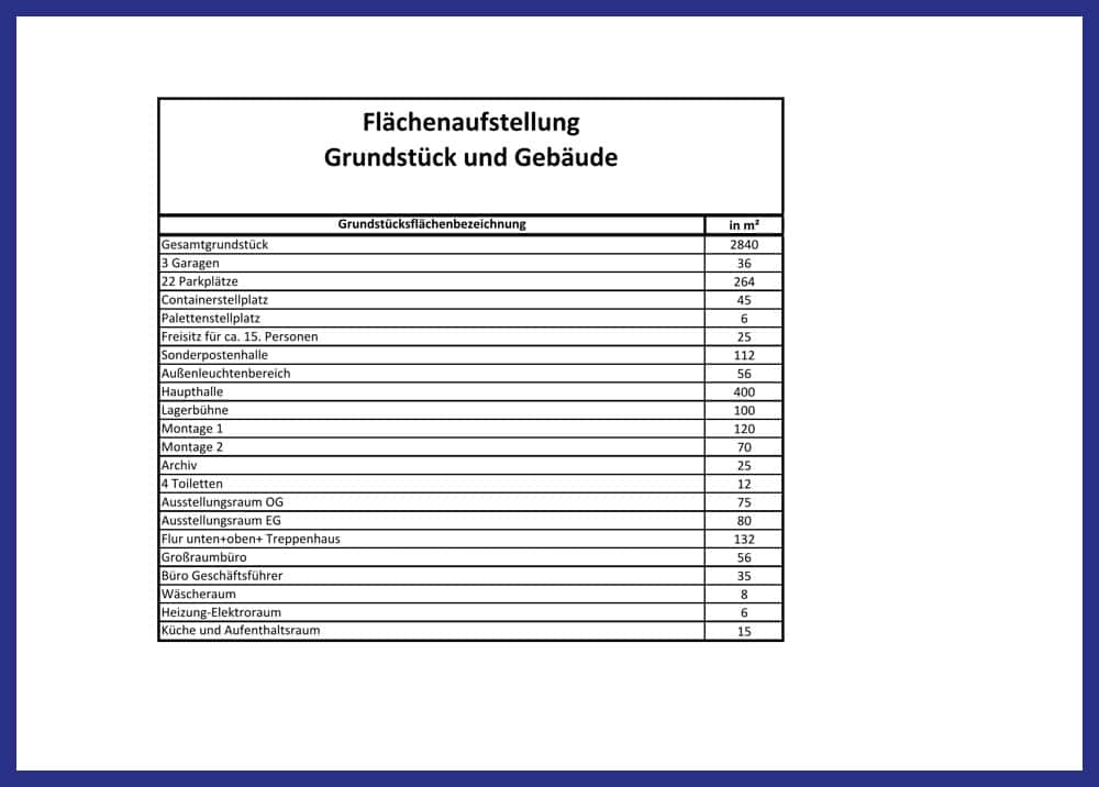 Bei dem angebotenen Objekt handelt sich um eine hochwertig errichtete und sehr gepflegte Gewerbeimmobilie. Das Grundstück mit 2840 m² ist gepflegt angelegt, verfügt über 22 Stellplätze und drei Garagen. Insgesamt stehen circa 1300 m² Gewerbefläche zur Verfügung. Die Immobilie gliedert sich in einen Hallenteil mit einer zweiten Lagerebene, circa 650 m². Der Hallenteil ist mit Lkw über zwei Sektionaltore befahrbar und wird momentan als Lager beziehungsweise Kommissionierungsbereich verwendet.