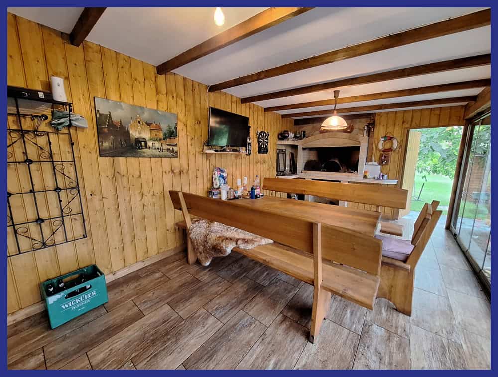 Daran angegliedert befindet sich ein Wintergarten sowie ein überdachter Terrassenbereich mit ca. 30 m². Die Einliegerwohnung kann als Ferienwohnung genutzt werden oder für ein großes Kind als separater Wohnbereich dienen.