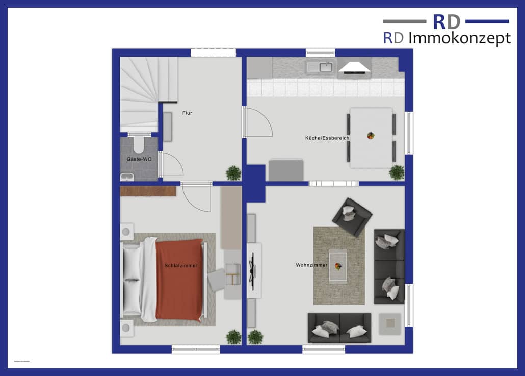 Das Erdgeschoss gliedert sich in einen Eingangsbereich mit Übergang zum Flur. Hier ist ein kleines Gäste-WC mitangegliedert. Ansonsten befinden sich im Erdgeschoss die Wohnküche mit Übergang in das Wohnzimmer sowie ein Schlafzimmer.