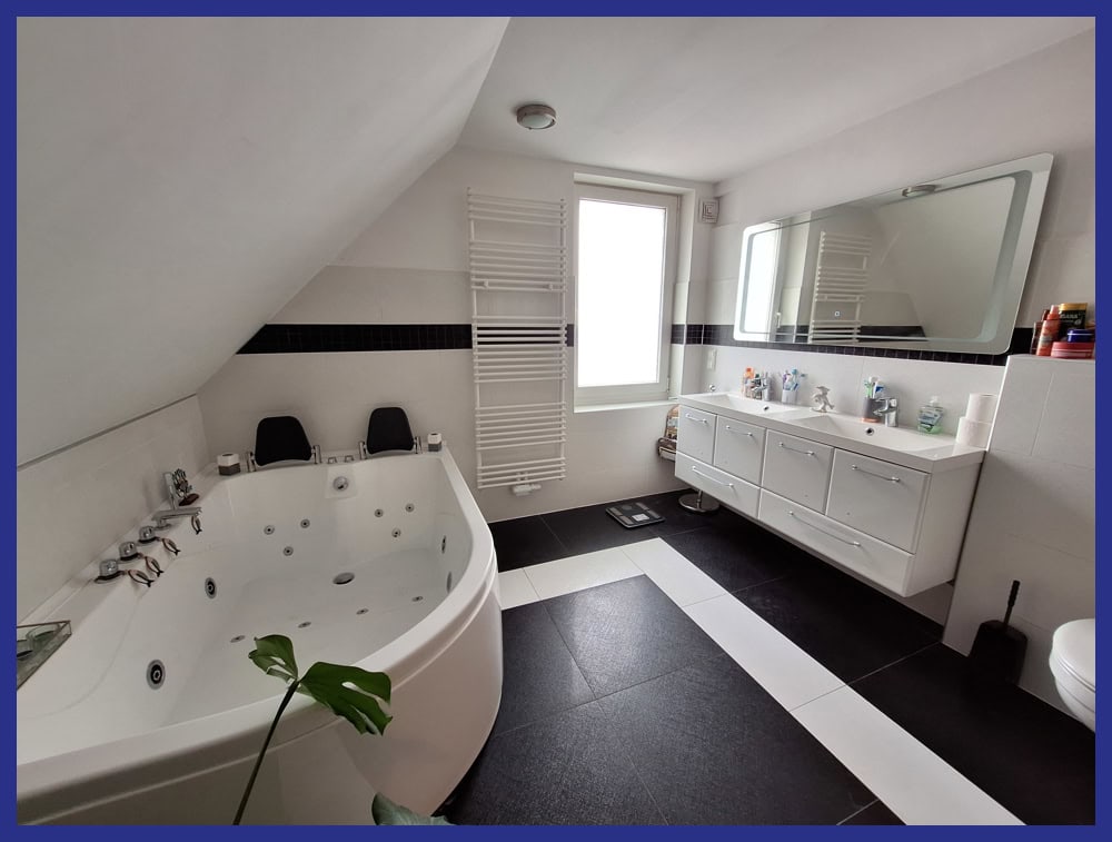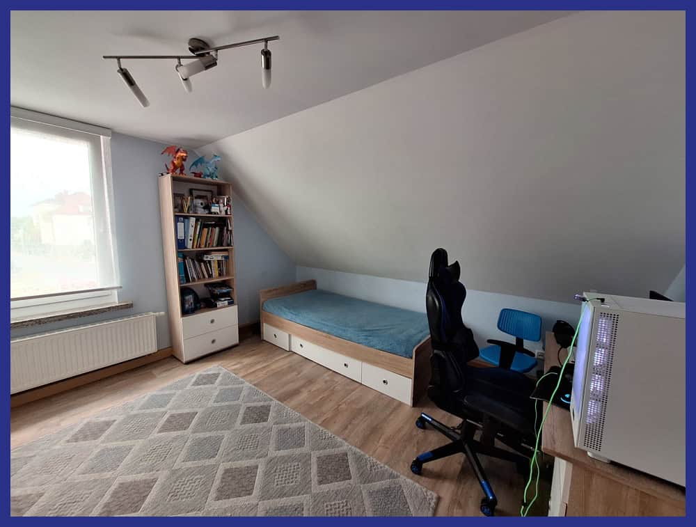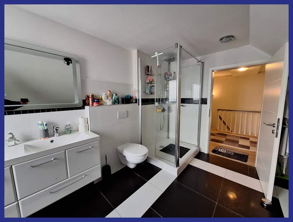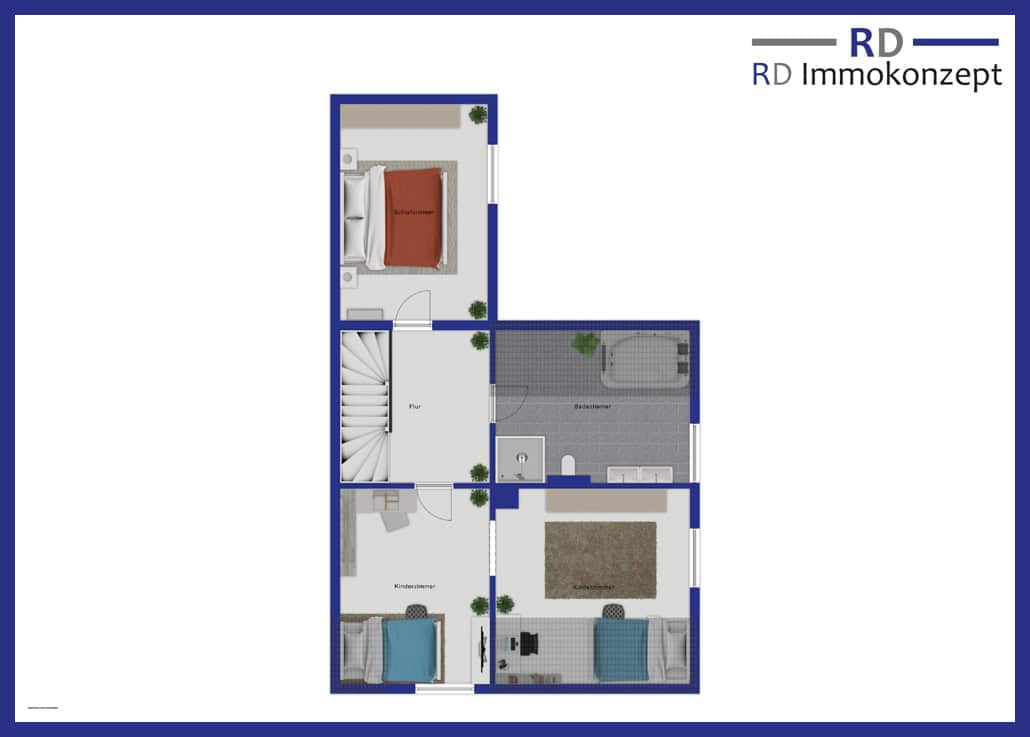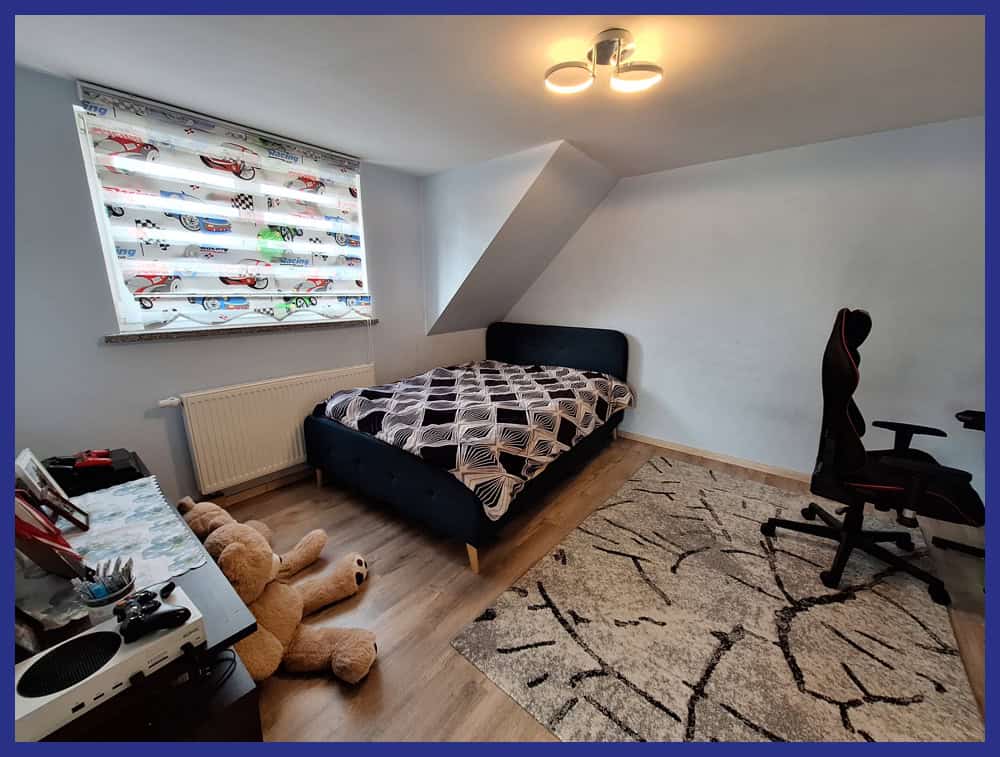 Das Obergeschoss gliedert sich in zentralen Flur, Elternschlafzimmer, Bad mit Badewanne und großzügiger Dusche sowie zwei Kinderzimmern, wobei eins als Durchgangsbereich geschnitten ist. Der Dachboden selbst ist nicht ausgebaut.