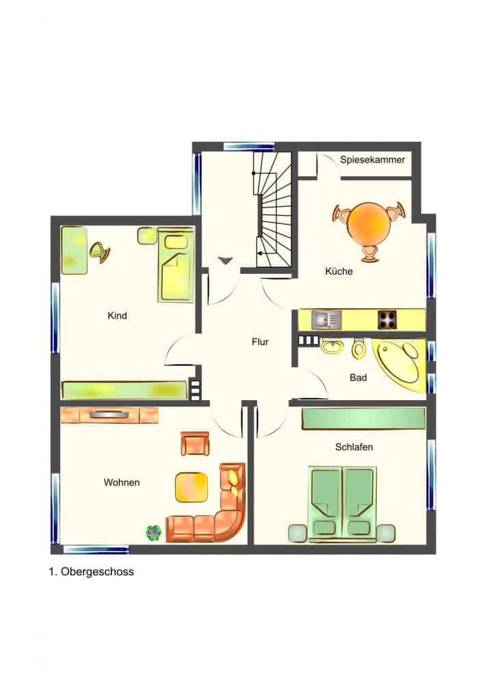 Das angebotene Mietobjekt befindet sich im 1. OG eines Dreifamilienhauses und verfügt über ca. 86 m² Wohnfläche. Die große Wohnküche verfügt über eine angegliederte Speisekammer und genügend Platz für eine gemütliche Sitzecke. Das Bad verfügt über WC, Waschbecken, Eckbadewanne mit Duschmöglichkeit und ist ca. 5 m² groß. Weiterhin steht ein Elternschlafzimmer mit ca. 17 m², ein Kinderzimmer mit 18 m² sowie ein Wohnbereich mit 18 m² zur Verfügung. In der Wohnung wird gerade die Elektrik überholt und danach frisch gemalert. Die Zimmer sind aufgrund der Raumhöhen mit 2,65 m und den großen Wohnfenstern sehr hell und angenehm. Die Fenster verfügen alle über Rollläden.