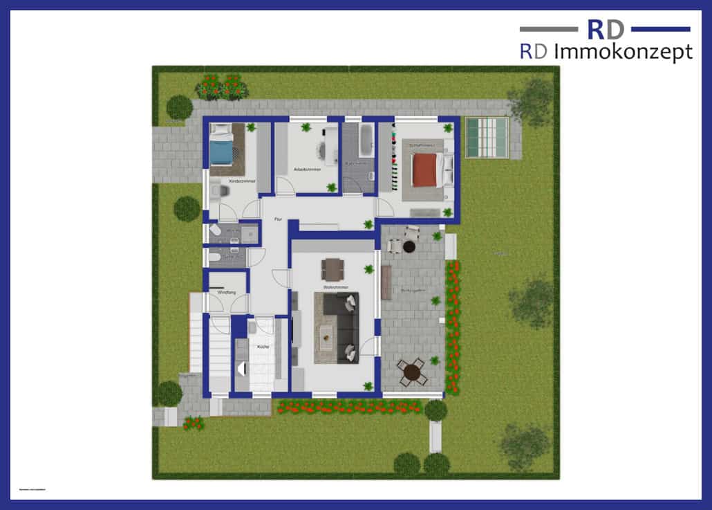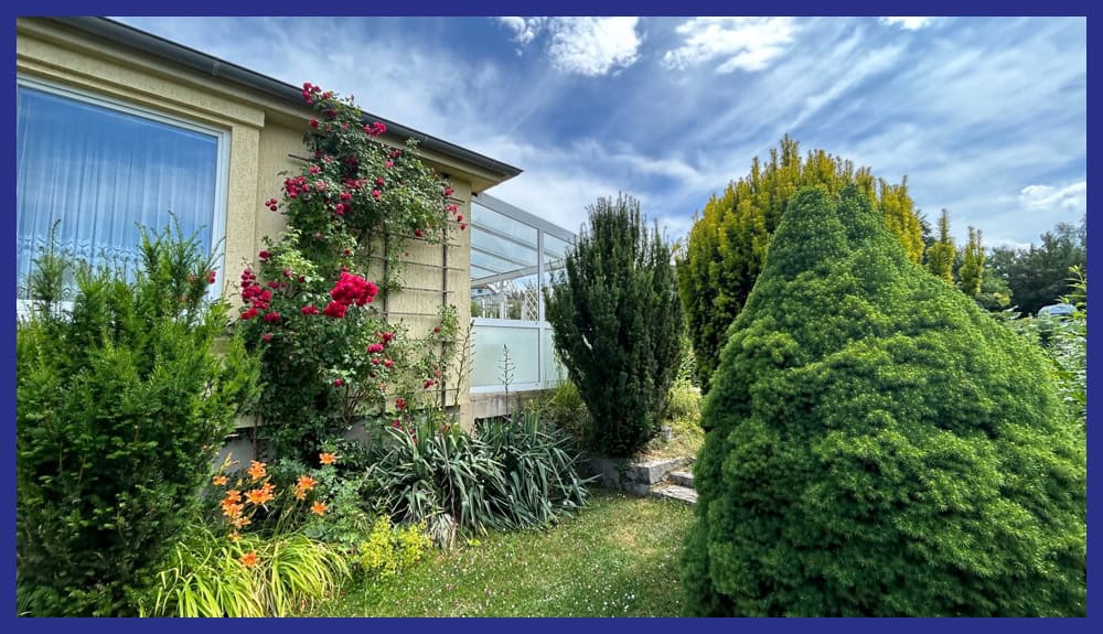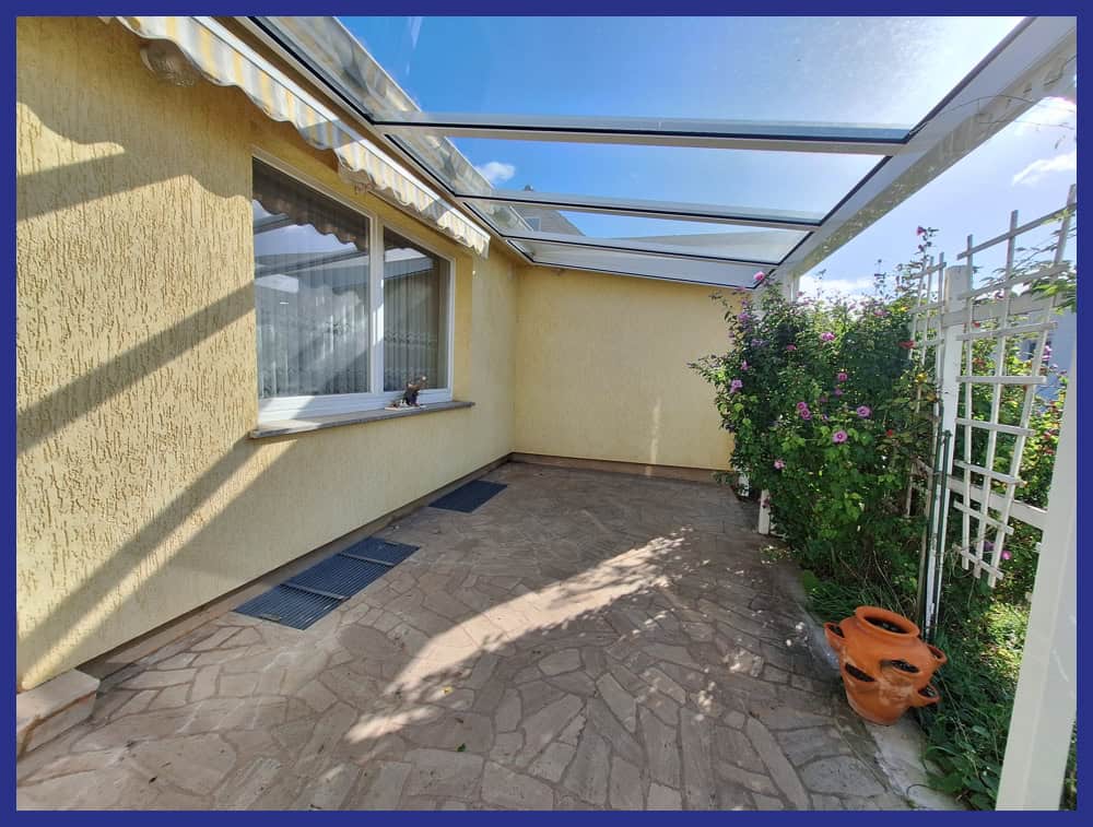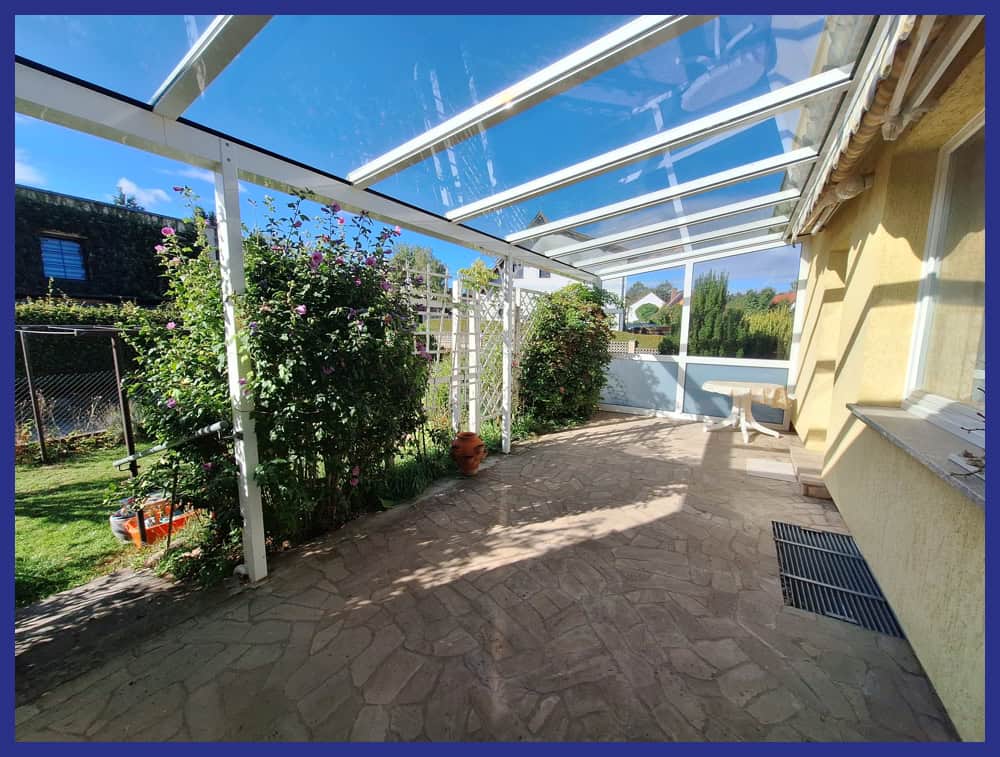 Das Grundstück ist perfekt ausgerichtet. Eingang und Garage gehen nach Norden. Terrasse und Garten öffnen sich nach Süden. Die mit einem Glasdach und elektrischer Markise versehene Terrasse lässt sich mit ca. 20m² wie ein erweitertes Wohnzimmer nutzen.